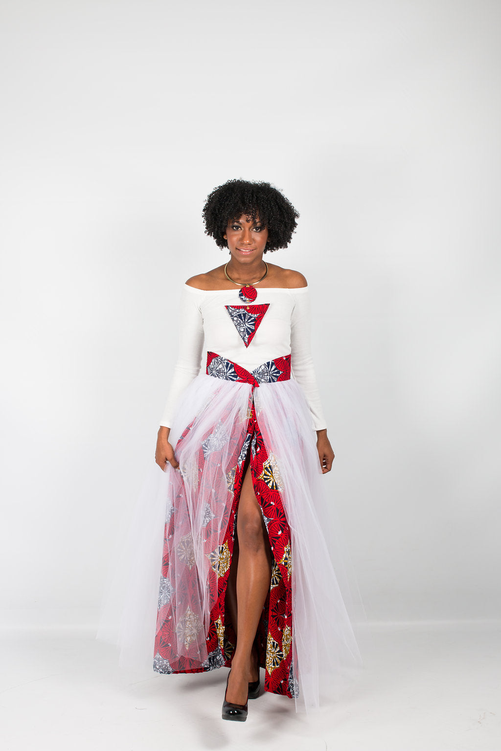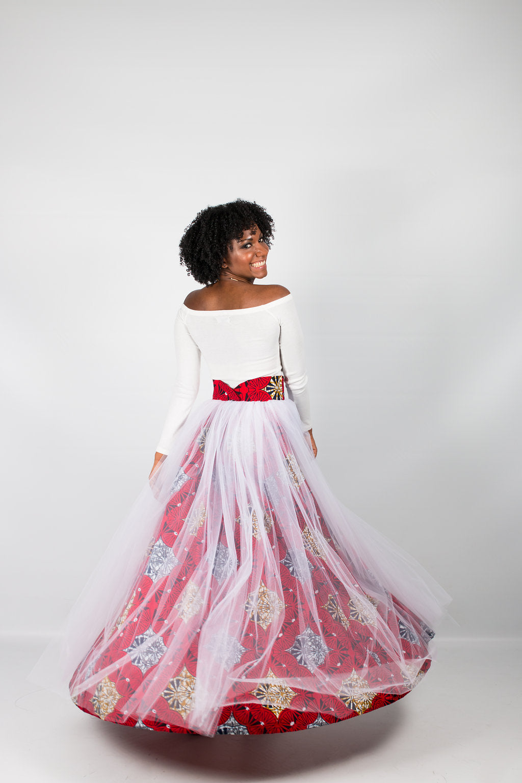 Maxi white tulle skirt with red African print underneath. Wrap skirt with snaps at waist.