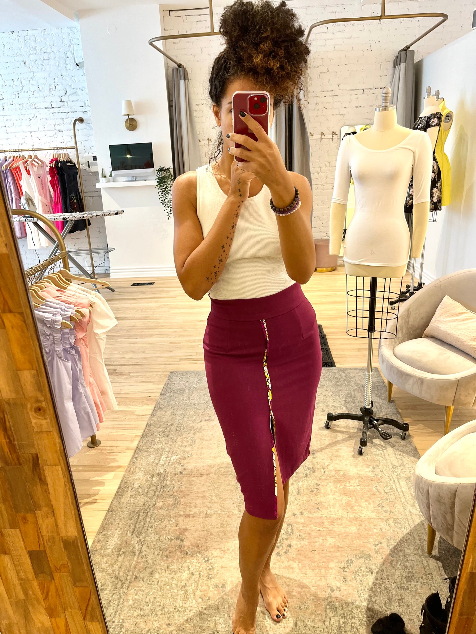 Pencil high waist skirt with a split on central front . The split is highlighted with cute print coton fabric. Apparent zipper and two invisible snaps at the back.
